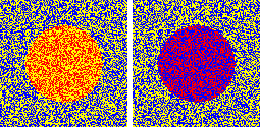 Randomly dotted color illusion: The left red square appears to be orange while the right red one appears