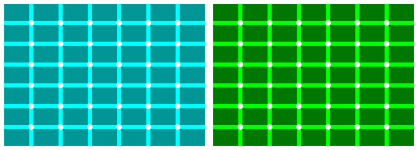 White's dotted lightness illusion: The left gray square appears to be lighter than the right one, though they are identical in lightness.