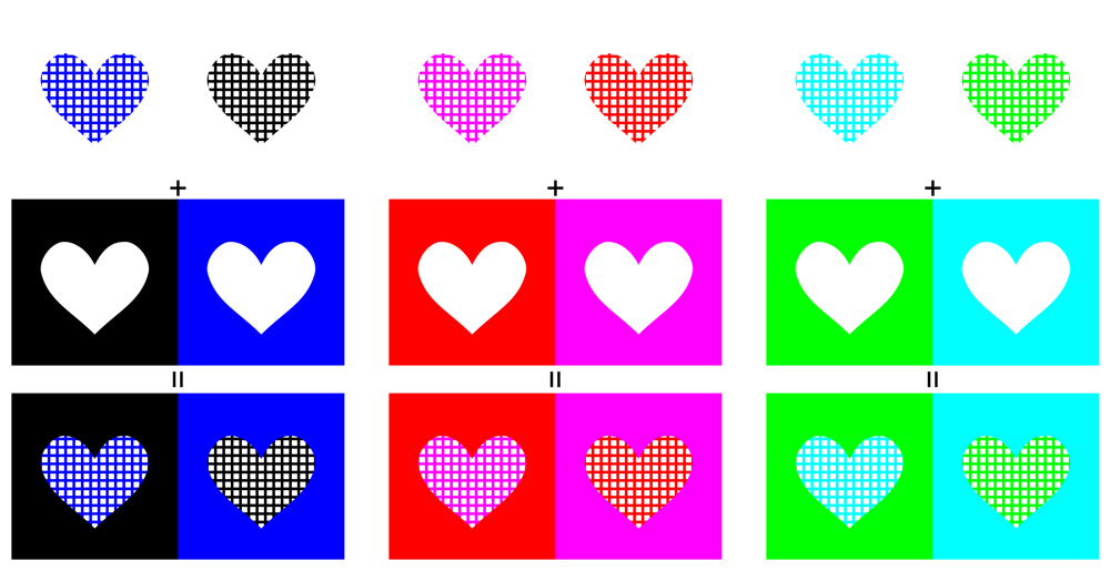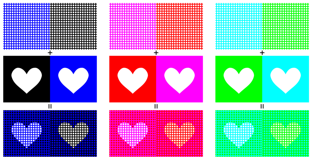 The right heart (R=255, G=255, B=255) in each block appear to be yellowish, induced by the chromatic dungeon illusion. To download high-resolution files, click here (4000 x 2060 pixel, 10MB)