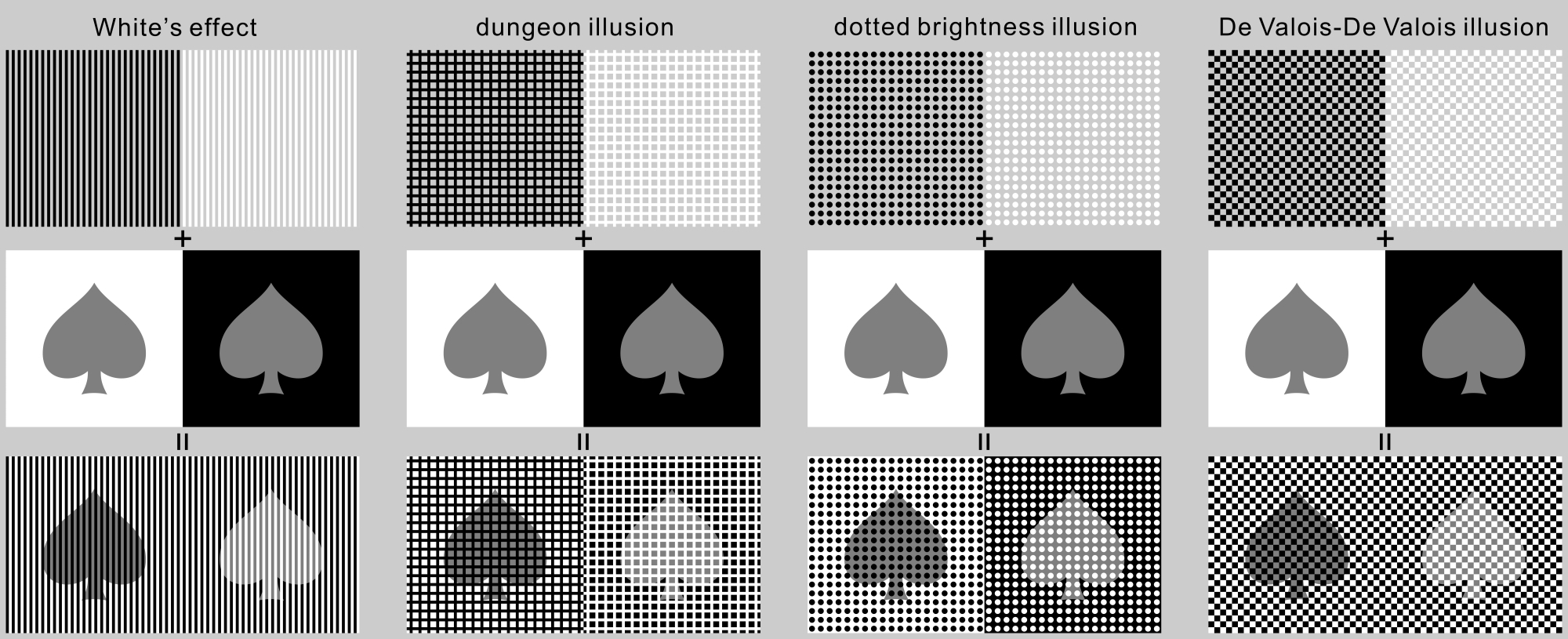 Spades of the same brightness (R=127, G=127, B=127) appear to be darker or brighter, induced by White's effect, Bressan's dungeon illusion, White's dotted brightness illusion, and the De Valois-De Valois illusion. To download high-resolution files, click here (8000 x 3262 pixel, 5MB)