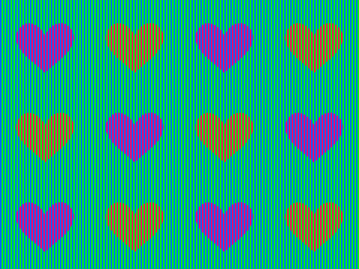 Hearts of the same color (R=255, G=0, B=127) appear to be pink or orange, induced by the Munker illusion, the chromatic dungeon illusion, the dotted color illusion, and the De Valois-De Valois illusion. To download high-resolution files, click here (8000 x 3262 pixel, 10MB)