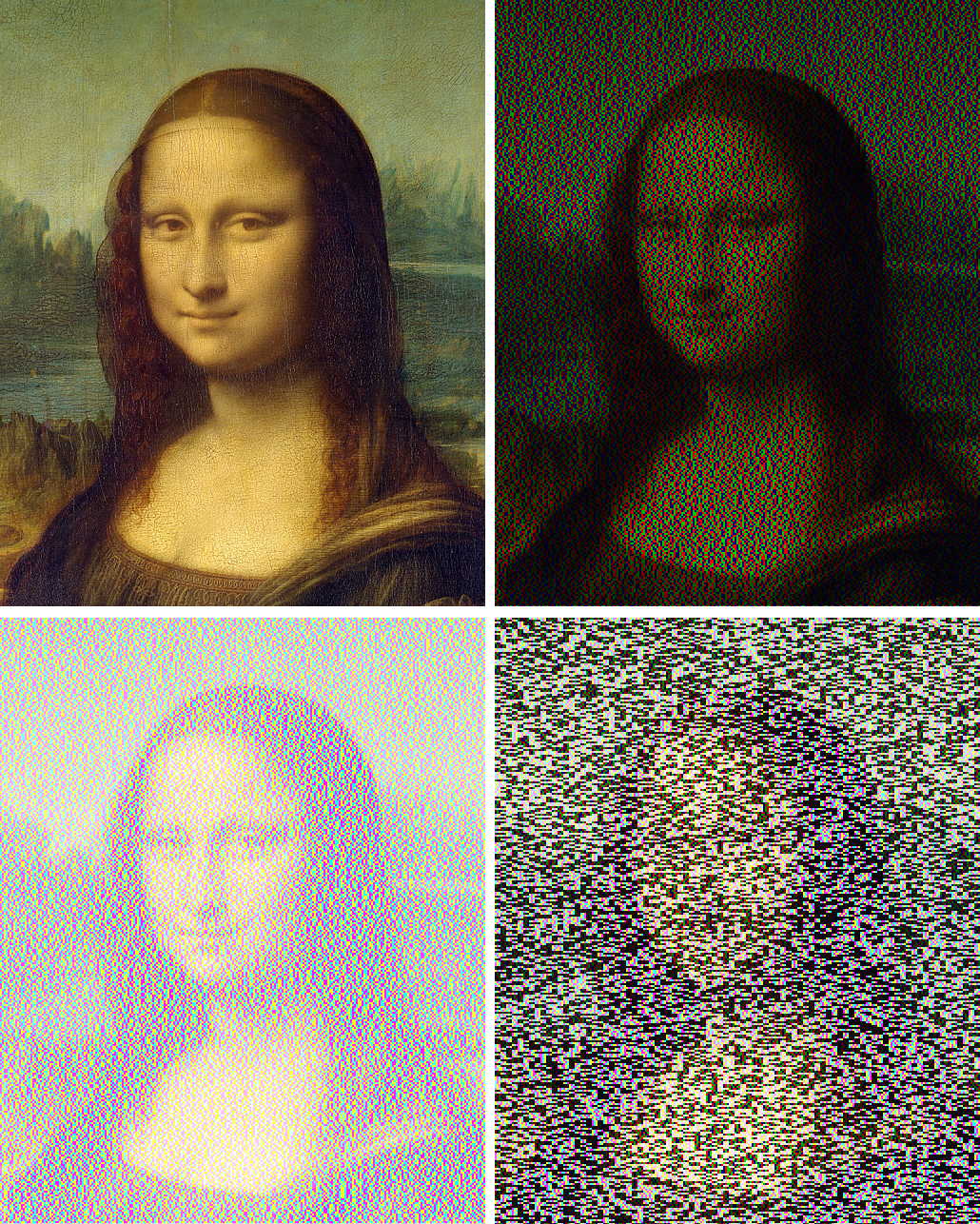 "Mona Lisa with spatial color mixture made up of red and cyan (left: additive color mixture, right: subtractive color mixture)"