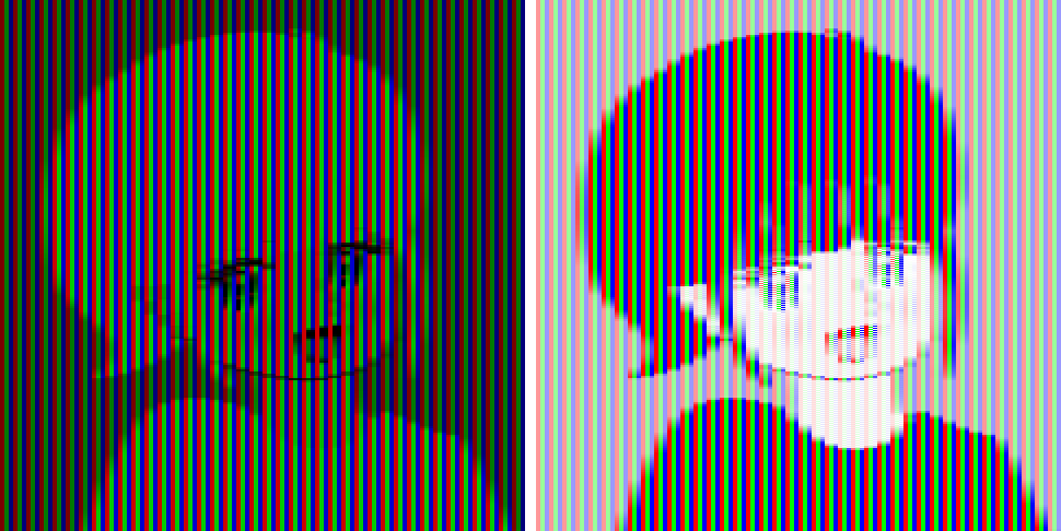 "Mona Lisa with spatial color mixture made up of green and magenta (left: additive color mixture, right: subtractive color mixture)"