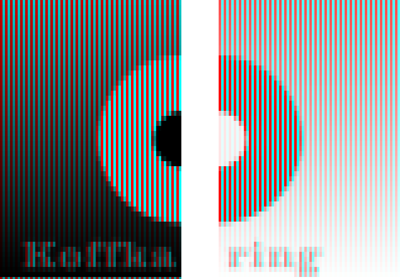 The apparent white in the left image is the same as the apparent black in the right one. They consist of red and cyan stripes.