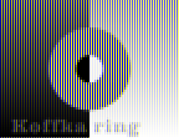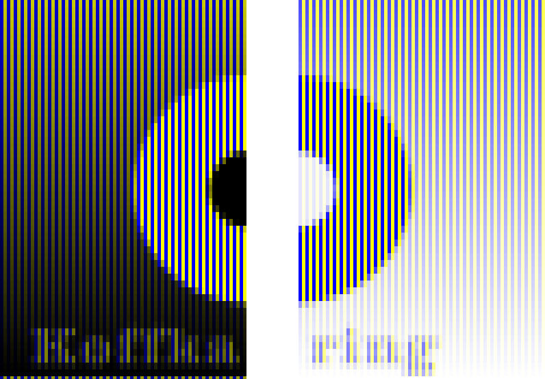 "Mona Lisa with spatial color mixture made up of blue and yellow (left: additive color mixture, right: subtractive color mixture)"