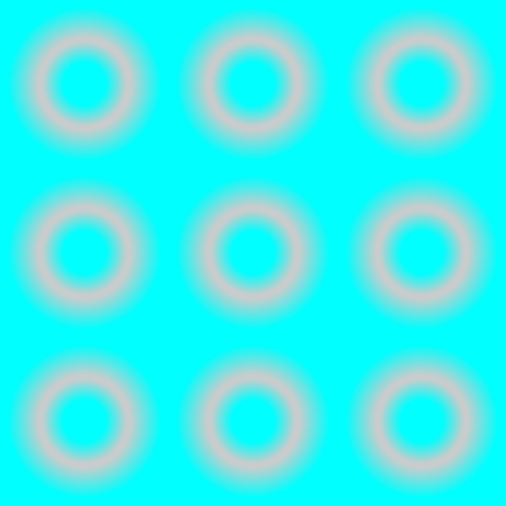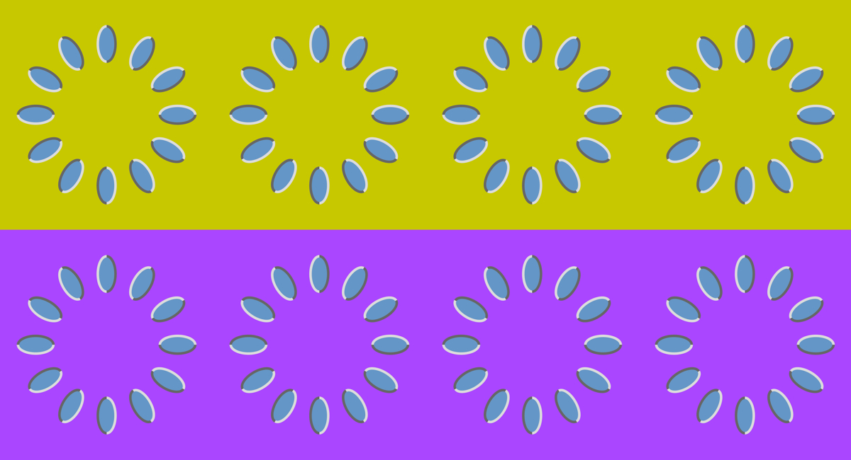 The rings of the upper row appear to be blusih whereas those of the lower one to be greenish, though they are the same color (R100, G150, B200). In addition, the former appear to rotate counterclockwise whereas the latter to rotate clockwise.