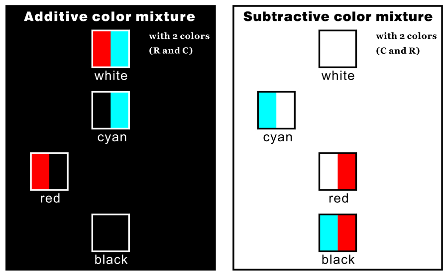 Lower right: mixture of additive and subtractive color mixtures of spatial color mixture