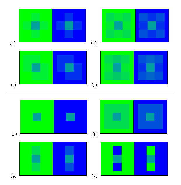 (a)-(g) The central square in the left half appears to be more bluish or less greenish than that in the right one, though they are identical in color. (a)-(d) are the new demonstrations. (e) is the standard type. (f) is known (I guess). (g) is the enhanced color contrast I presented before. (h) is chromatic White's effect, where the central square in the left half might appear to be more greenish or less bluish than that in the right one.