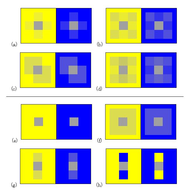 (a)-(g) The central gray square in the left half appears to be more bluish or less yellowish than that in the right one, though they are identical in color. (a)-(d) are the new demonstrations. (e) is the standard type. (f) is known (I guess). (g) is the enhanced color contrast I presented before. (h) is chromatic White's effect, where the central gray square in the left half might appear to be more yellowish or less bluish than that in the right one.
