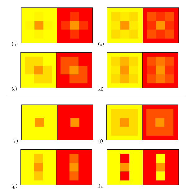 (a)-(g) The central square in the left half appears to be more reddish or less yellowish than that in the right one, though they are identical in color. (a)-(d) are the new demonstrations. (e) is the standard type. (f) is known (I guess). (g) is the enhanced color contrast I presented before. (h) is chromatic White's effect, where the central square in the left half might appear to be more yellowish or less reddish than that in the right one.