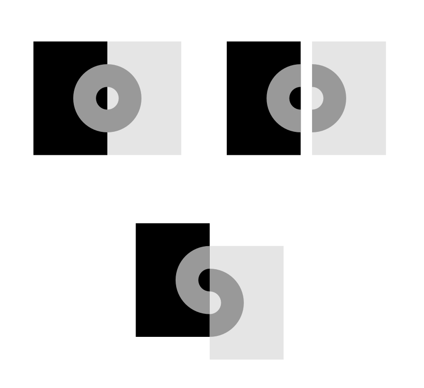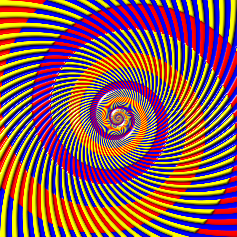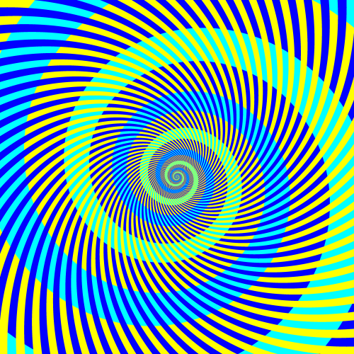 The upper half shows a white spiral and a black one in the left image while a yellow spiral and a blue one in the right image. The colors of these spirals are quite the same in the lower half, but the colors appear to be similar between the left spirals and the right ones. That is, white appears to be yellowish and black appears to be bluish in the lower-left image, whereas yellow appears to be less vivid and blue appears to be less vivid in the lower-right image. These color effects are based upon the Munker illusion. Moreover, there is a "color-illusion aftereffect". Fixate at a point in the upper half for a while, and look at the corresponding point in the lower half; then the left spirals appear to be more vivid than the right ones though the former are white or black!