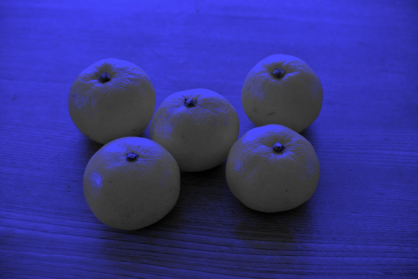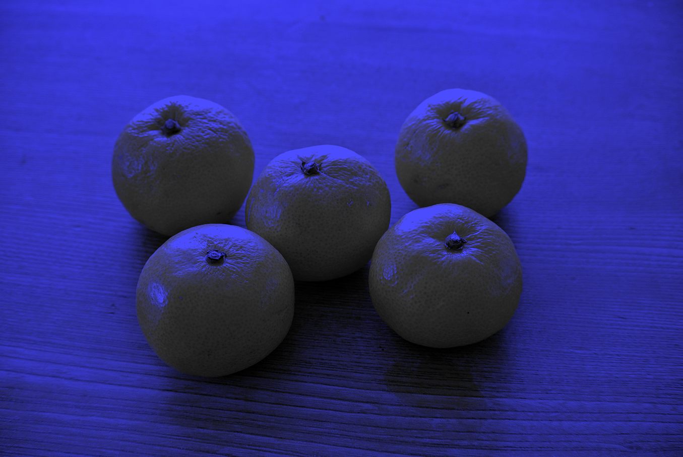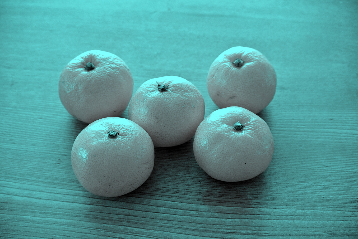 There appear to be illusory red strawberries though this image consists of pixels of cyan hue.