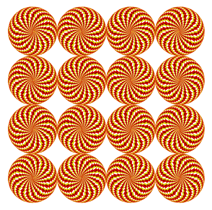 Concentric circles appear to be a spiral (spiral illusion). Each apple appears to rotate (peripheral drift illusion).