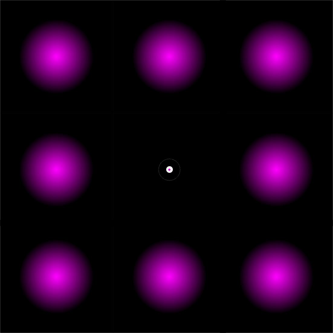 "If you focus on the dot, the purple spots vanish, coming back when you move your eyes. I assume this is due to the fact that the dots are soft edged and in the peripheral vision which is sensitive to motion. This area presumably quickly discounts the dots as there are no hard edges. However most of the peripheral vision is black and white and this is a strong colour effect, is it just that they are not far enough out of the colour vision filed but the lack of motion effect still exists." (Mike Wilsher)