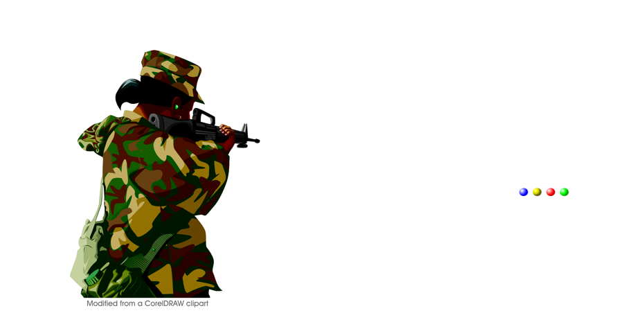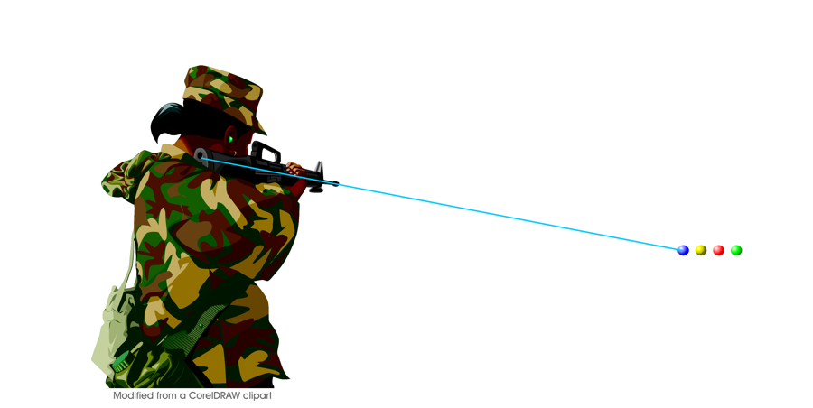 The soldier appears to aim his gun at the red or green balls, but he is actually shooting the blue one as shown below. The original idea was proposed by Professor Eiji Watanabe.