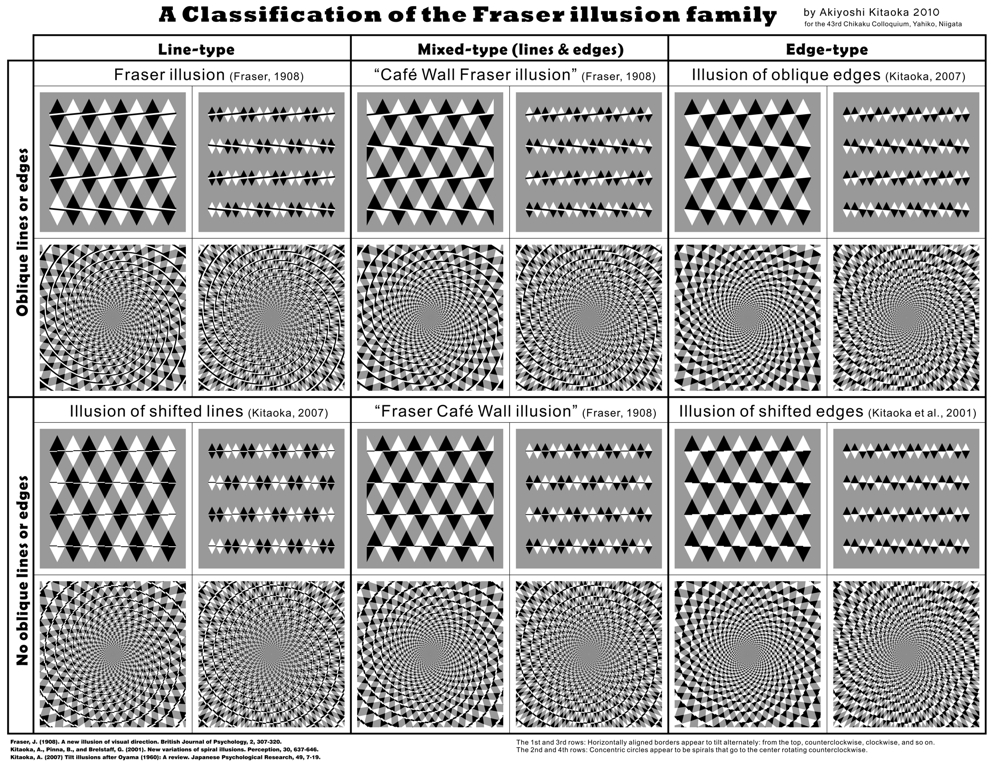 It is demonstrated that the Fraser illusion (Fraser, 1908 British Journal of Psychology 2 307-320), known as one of the classic tilt illusions or as the name of “twisted cords”, is a member of the “Fraser illusion family”, which includes of six types of tilt illusions. In the family, there are two factors to classify the six illusions. One is whether inducers are obliques or “shifted horizontals”. The other is whether inducers are only lines, only edges, or mixture of lines and edges. When inducers are oblique lines, the Fraser illusion appears. When inducers are oblique edges, the image shows the illusion of oblique edges (Kitaoka, 2007 Japanese Psychological Research 49 7-19). When inducers are made up of oblique lines and edges, the “Café Wall Fraser” illusion (Fraser, 1908) is obtained. In contrast, when inducers consist of horizontal lines and edges, the “Fraser Café Wall” illusion (Fraser, 1908) is shown. When inducers are shifted lines, the illusion of shifted lines (Kitaoka, 2007) appears. When inducers are shifted edges, the illusion of shifted edges (Kitaoka, 2007) is observed. A close relationship between this family of geometrical illusions and a series of motion illusions including reversed phi is discussed.