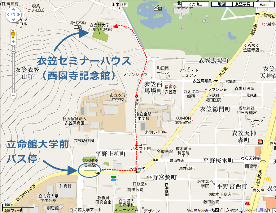 A photo of the venue Kinugasa Seminar House (Saionji-kinen-kan). It takes ten minutes to walk from the Ritsumeikan University bus terminal (the lower place in the map shown below) to the venue (the upper place).