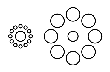 Wundt (1898, Fig. 49) cited this image as Ebbinghaus' figure. Kitaoka (2005), however, inferred that the first scholar who produced this illusion (= Ebbinghaus size illusion, Ebbinghaus areal illusion, Titchener illusion, Titchener circle, etc.) might be in fact Lipps, since the figure is found (without reference) in a monograph by Lipps (1897, p. 222), a year before Wundt's monograph and also earlier than the textbooks by Ebbinghaus (1902) or Titchener (1901). Recently, Walter H. Ehrenstein, University of Dortmund, found that Thiéry showed this image with explicit reference to Ebbinghaus even earlier (Thiéry, 1896, pp. 84-85; Figs. 51A and 51B). Thus, it is strongly suggested that the above figure has indeed originated with Ebbinghaus as had been suggested before by Ehrenstein & Hamada (1995, p. 158), based on Wundt’s (1898) account. Below is Walter's opinion: