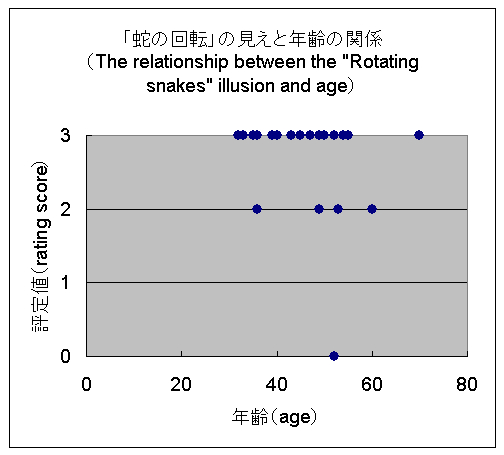 The relationship between the "Rotating snakes" illusion and age has been suspected. I examined this point in a lecture entitled "Psychology of Illusion" invited by the University of the Air. Twenty-five students participated. The age ranged between 32 and 70. The items for answer were "Rotating snakes appear to move well" (score 3), "Rotating snakes appear to move" (score 2), "Rotating snakes appear to move slightly" (score 1), and "Rotating snakes do not appear to move at all" (score 0). As a result, twenty-four observers reported that they saw illusory motion while one observers did not see any motion (the lower figure). This only person suffered from the lack of three quarters of the visual field. For the visible observers, there was no correlation between the illusion magnitude and age.