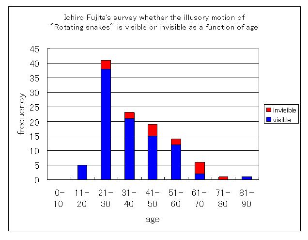 Ichiro Fujita, professor of the Osaka University, examined the relationship between the visibility of "Rotating snakes" illusion and age. As a result, the older the observers are, the more frequent those who did not see the illusion.. <February 8, 2007>