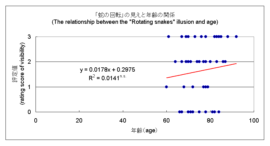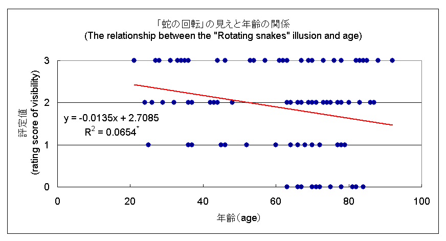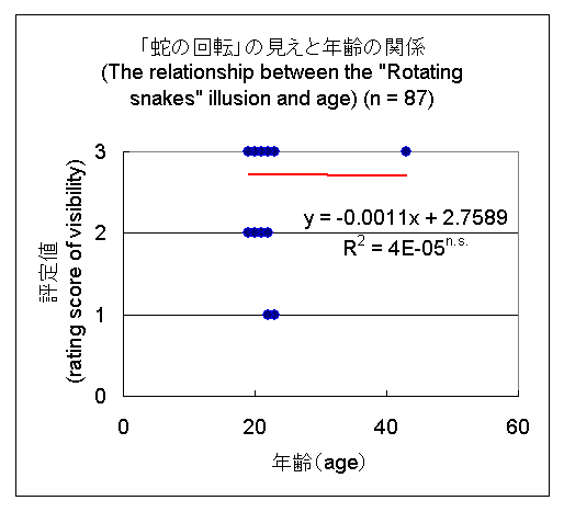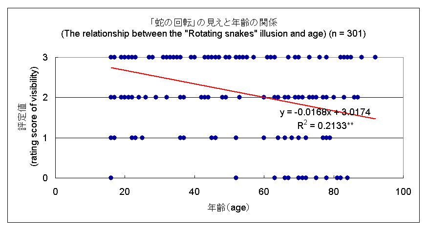 The graph shown below displays the combined data that have been collected so far. A strong negative correlation (r = -.46) was found between the Rotating Snakes illusion and age! This does not necessarily mean that the older the observer is, the less visible the illusion. This indicates that some unknown characteristics of this illusion are related to age while this illusion is not related to aging.