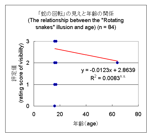 The relationship between the "Rotating snakes" illusion and age has been examined several times. Here are additional data from students of a high school and the Ritsumeikan University. The items for answer were "Rotating snakes appear to move well" (score 3), "Rotating snakes appear to move" (score 2), "Rotating snakes appear to move slightly" (score 1), and "Rotating snakes do not appear to move at all" (score 0). As a result, young people tend to see this illusory rotation strongly. <October 17, 2007>