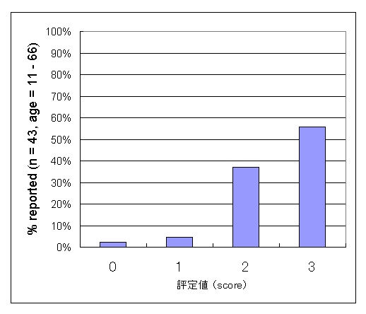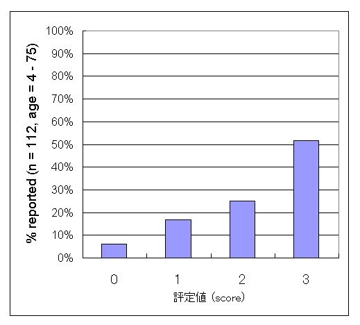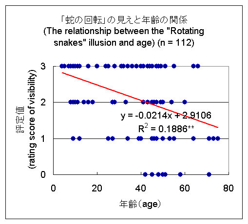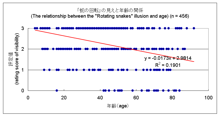 The relationship between the "Rotating snakes" illusion and age has been examined several times. Here are additional data from participants of my talk (in Japanese) in the Shizuoka Science Museum "Ru-ku-ru". The items for answer were "Rotating snakes appear to move well" (score 3), "Rotating snakes appear to move" (score 2), "Rotating snakes appear to move slightly" (score 1), and "Rotating snakes do not appear to move at all" (score 0). As a result, young people tend to see this illusory rotation strongly. <February 11, 2008>
