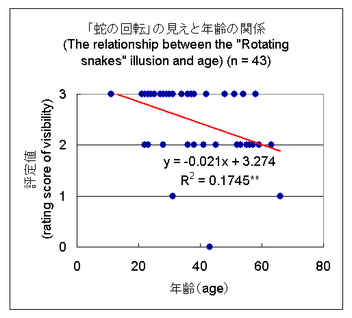 The relationship between the "Rotating snakes" illusion and age has been examined several times. Here are additional data from participants of a forum of mathematics held in the University of Tokyo (my talk). The items for answer were "Rotating snakes appear to move well" (score 3), "Rotating snakes appear to move" (score 2), "Rotating snakes appear to move slightly" (score 1), and "Rotating snakes do not appear to move at all" (score 0). As a result, young people tend to see this illusory rotation strongly. <February 4, 2008>