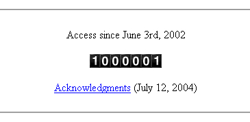 Access to the English page of Akiyoshi's illusion pages increased dramatically on 4th October, 2004. The number was 937,620 on 2nd October, while that became 997,308 at 4:40 pm (Japan time) on 4th October. I got the million number but could not stop my finger click, thus getting the number 1,000,001 as shown below. <October 4, 2004>