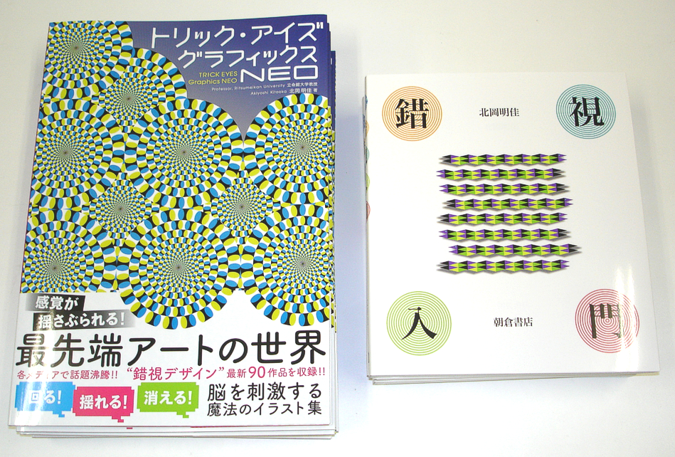 Akiyoshi's books --- Illusion catalogue --- Akiyoshi's nengajo --- Akachochin --- Koinobori --- Cherries ---A page of background motion --- Ritsumeikan's illusion --- U-zu-maki (Rabbits' spirals) --- 2003: An illusory space odyssey --- Kochi illusion design --- Toys of illusion --- Illusion personality tests --- Illusion quizzes --- Window of illusion --- Classification of anomalous motion illusion --- Comprehensive classification of illusions --- Exhibition of illusion designs 2004 --- Works of sinusoidally modulated radials --- Explorer --- TEG --- TEE --- ECVP waves --- Expanding flower --- Shadow-shade stereopsis --- Star arts--- Girl of blue eyes 3 2 1 --- Popple illusion --- "The four seasons in Japan"--- Illusion design "Lipsticks"--- L'ORÉAL Art and Science of Color Prize, Gold Prize 2006--- Tie designs--- Gestalt psychological works --- Newton Press book --- Illusion erasers --- TEM --- Illusory signs --- Illusion mugs --- Professor McCourt in Ritsumeikan --- Overview of brightness illusions --- Illusion of figure --- AIC2009 talk --- Drag "Fluttering hearts" --- IllusoriaMente Show Time 2012 in Alghero --- 4-stroke tilt illusion and motion--- ICP2016 Informal Illusion Designs --- Cats see Rotating snakes movies --- Fukushima as the Fruit Kingdom --- Illusion jigsaw puzzles --- APCV2014 Best Presentation Prize --- Professor Shapiro's talk in Ritsumeikan 2019