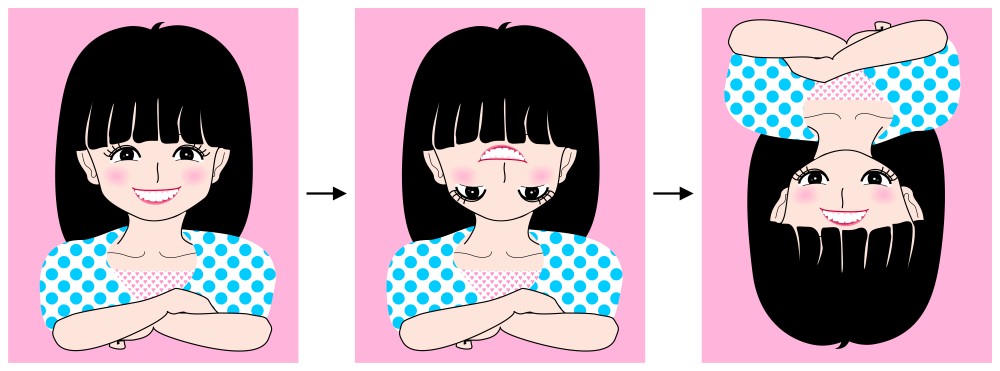 If the positions of eyes and the mouth are interchanged, the face appears to be funny as shown in the middle panel. When this funny face is rotated upside-down, it appears to be funny with a different impression as shown in the right panel. Demonstrating this effect, Valentine and Bruce (1985) argued against Parks (1983) who claimed the importance of the contour of a face as the frame of reference in the Thatcher illusion in which the upright face works better as the frame of reference than the inverted one.