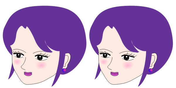 The eyes of the left image is physically the same as those of the right image. Moreover, the left eye is the same length as the right eye. Yet, in the left image, the right eye appears to be longer than the left eye. On the other hand, in the right image, the left eye appears to be longer than the right eye. In addition, both eyes appear to be aligned horizontally in the left image, while in the right image they appear to be misaligned, i.e., the left eye appears to be higher than the right.