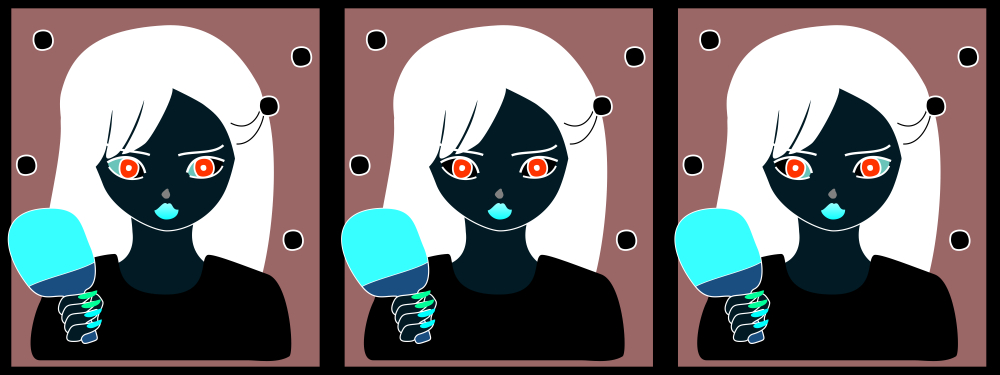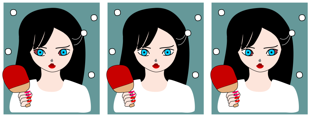 The luminance-induced gaze shift or the bloodshot illusion (Ando, 2002). Although the position of the iris and pupil in each eye's contour is the same among the three images, the apparent direction of gaze is shifted to the darkening part of the sclera (the white of the eye).