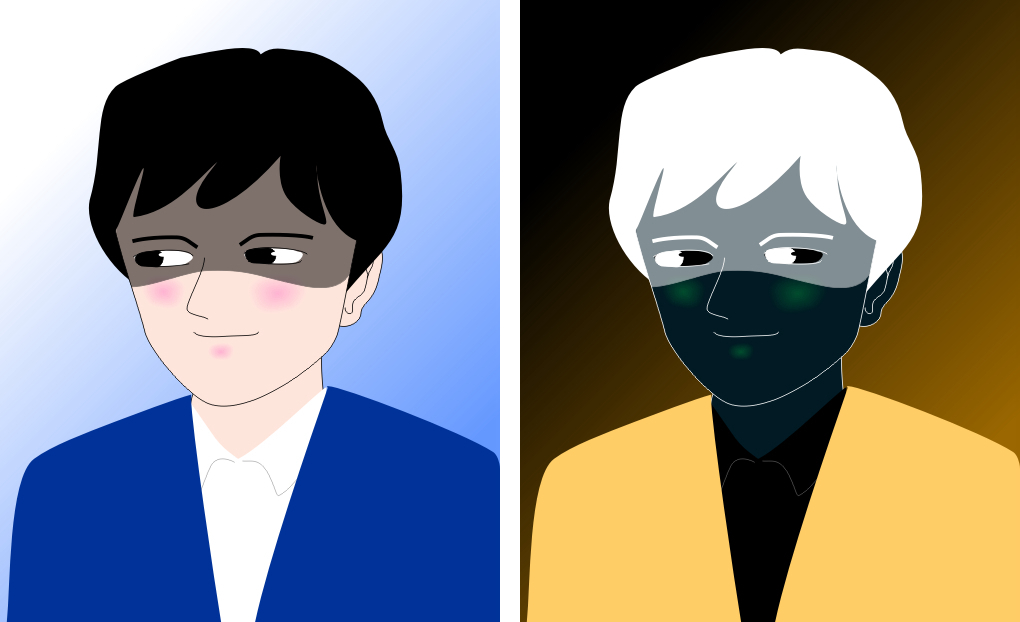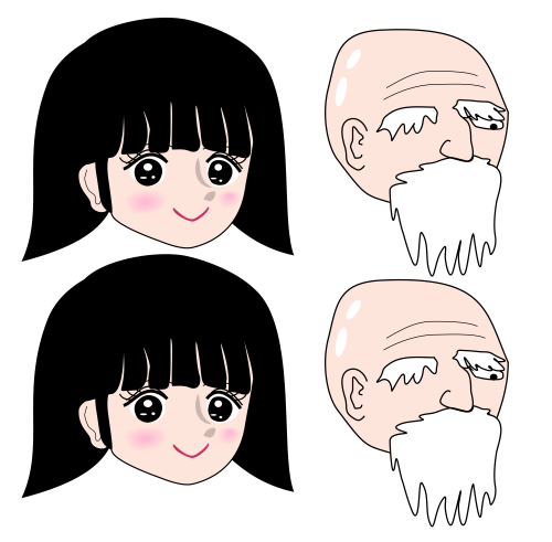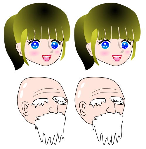 The left face appears to gaze at the observer while the right one appears to see rightward, though the eyes of the former are just the same as those of the latter. This phenomenon was proposed by Wollaston (1824). In addition, the pictorial size of the right eye is larger than that of the left one; this fact is realized more easily in the right image than in the left one.