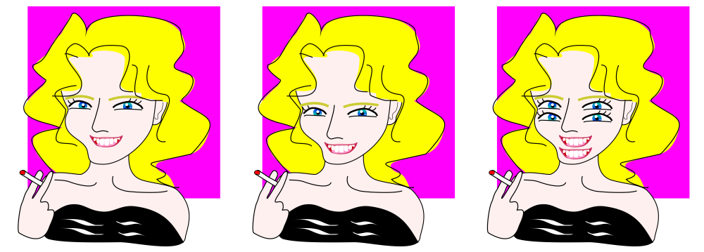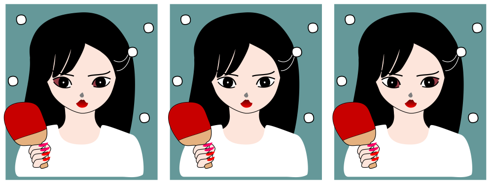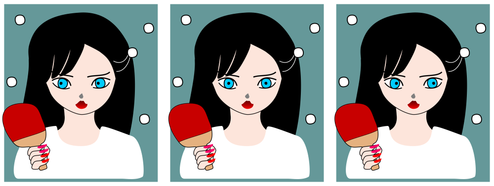 Although the position of the iris and pupil in each eye's contour is the same among the three images, the apparent direction of gaze tends to be shifted to the positional bias of the Purkinje-Sanson image, the bright spot shown on the iris (actually on the surface of the cornea).