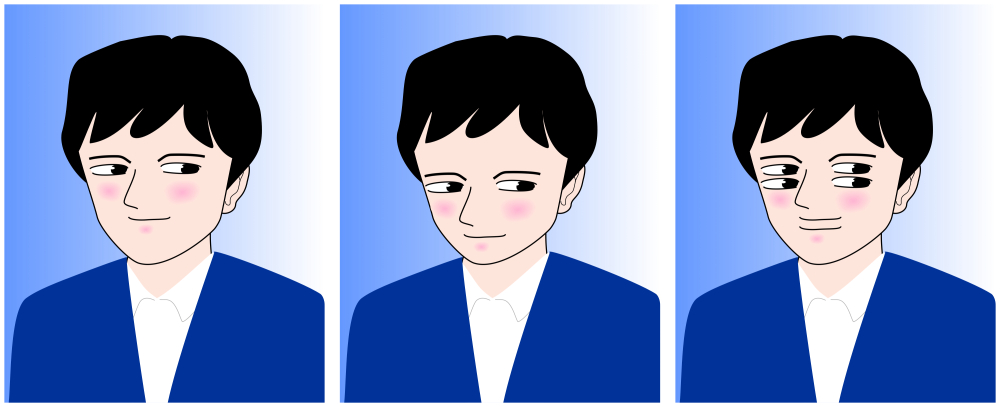 Although the position of the iris in each eye's contour is the same among the three images, the apparent direction of gaze tends to be shifted to the positional bias of the pupil.