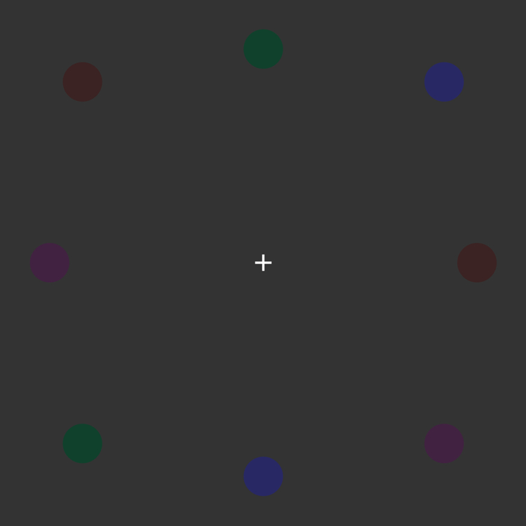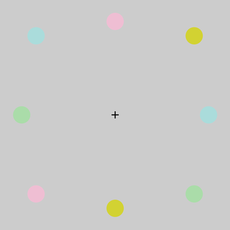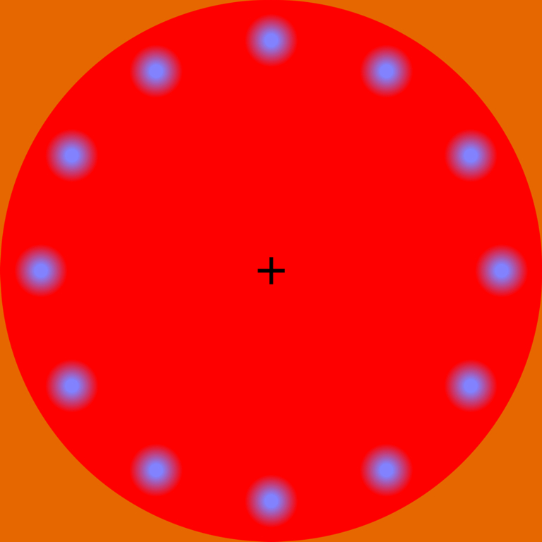 Colored dots appear to disappear if we fix our eyes on the blue dot at the center.