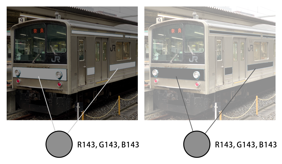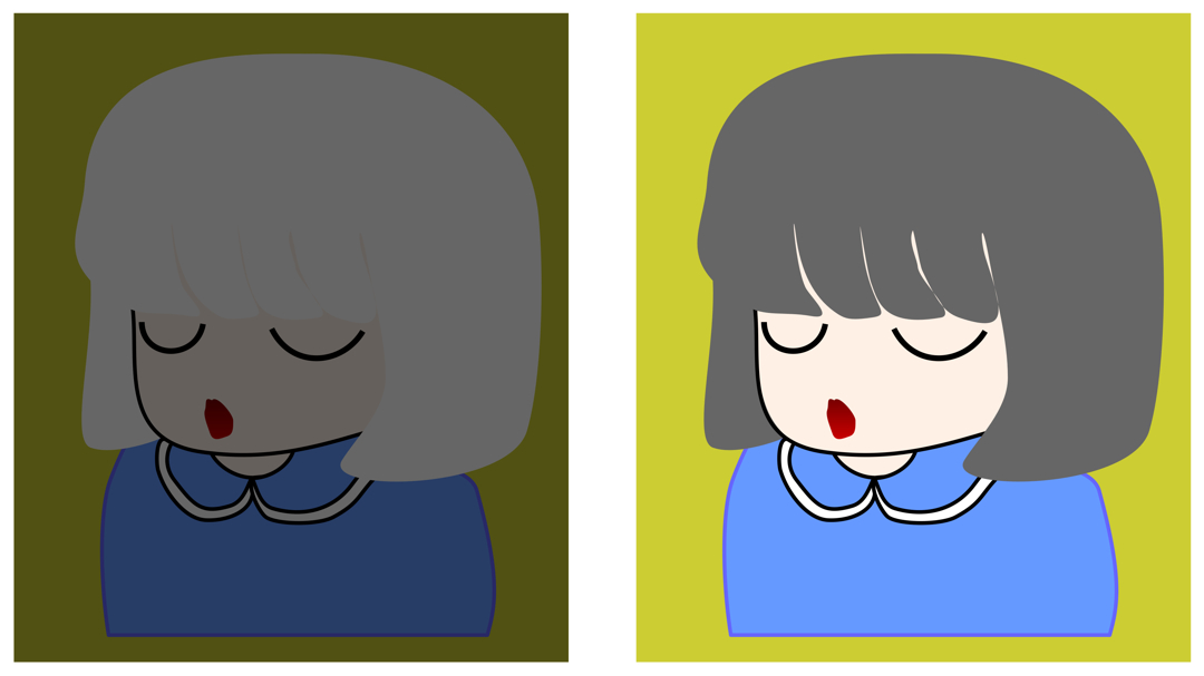 The hair and clothes in the left image appear to be whitish whereas those in the right one appear to be blackish, though the average luminance of the former is lower than that of the latter.