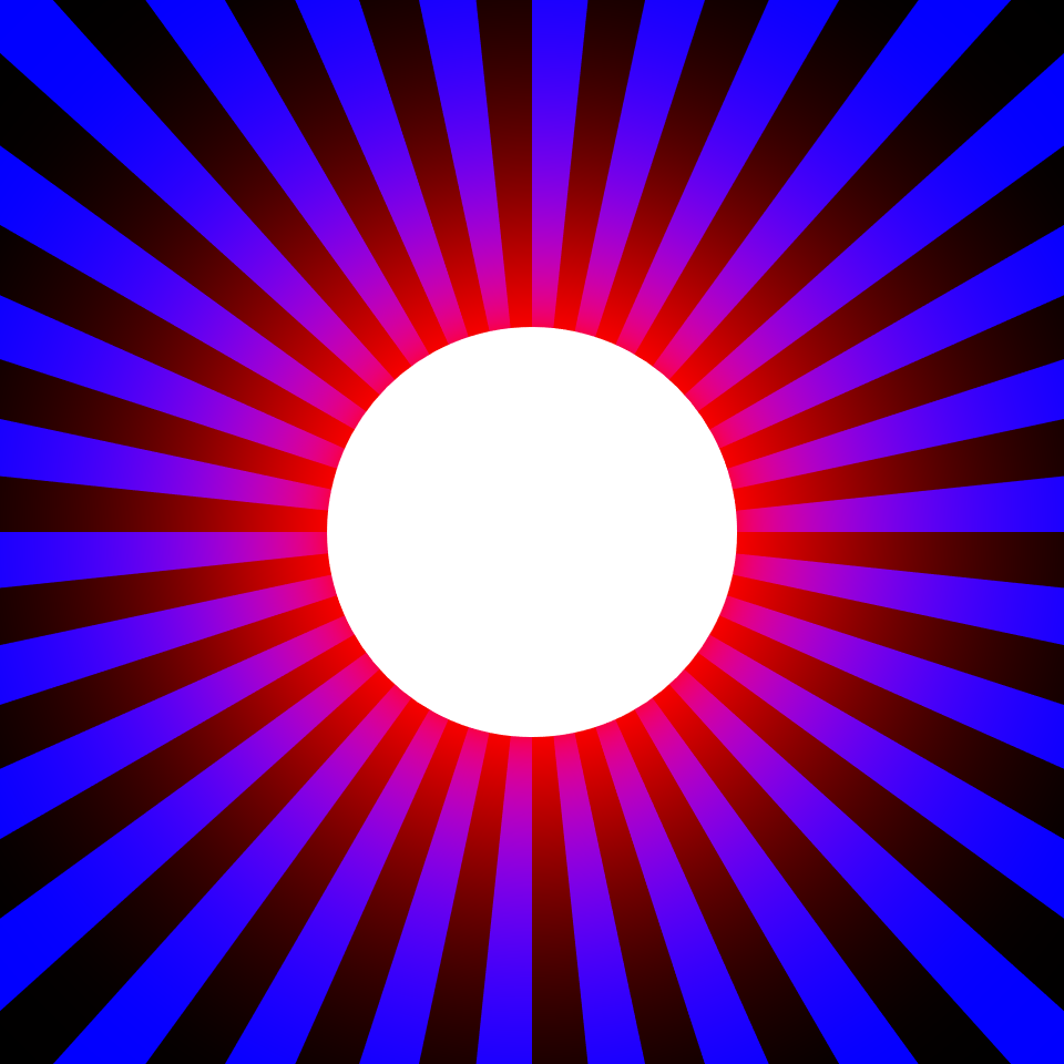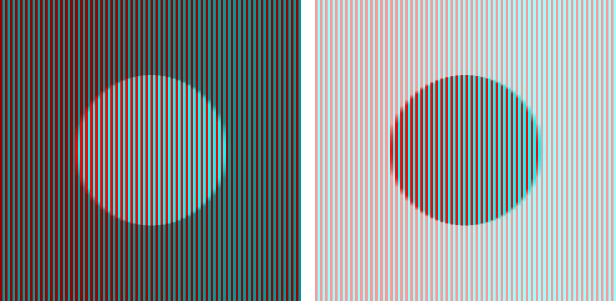 The left circle appears to be whitish and the right one looks like black, though they are the same stripes of red and cyan.