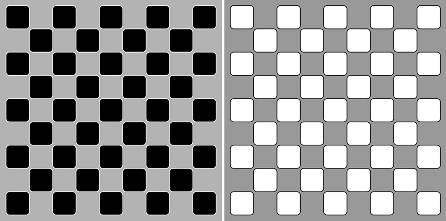 The bands in the left image appear to be whitish whereas those in the right one appear to be blackish, though they are the same luminance.
