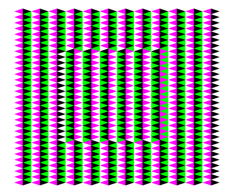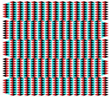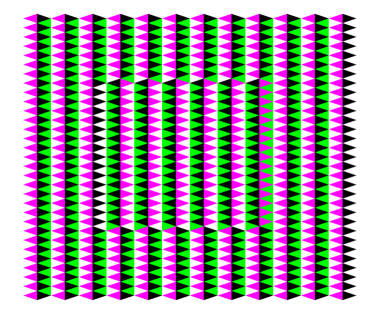 The inset appears to move rightward. If those who wear glasses observe this image through the lens off the center by heading laterally, they will find black-red-white-cyan patterns and blue-magenta-yellow-green ones, though the colors are actually black, magenta, white and green.