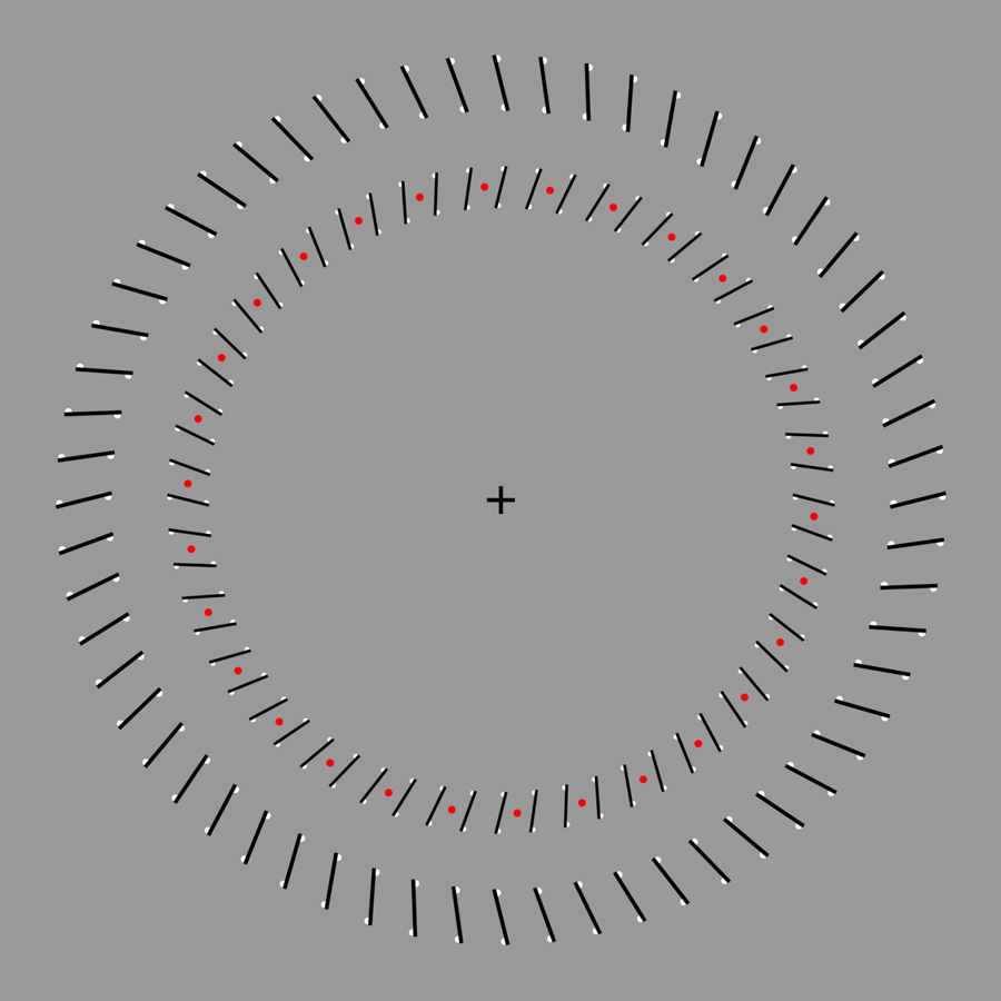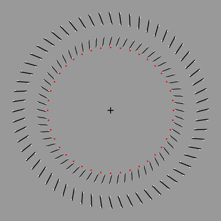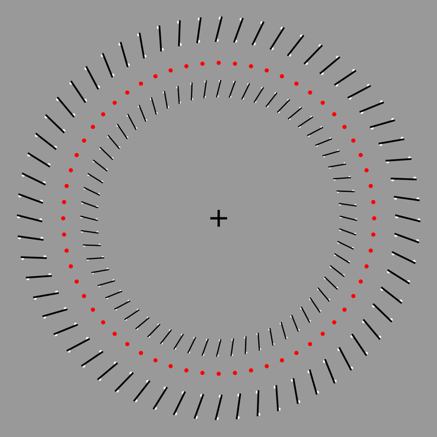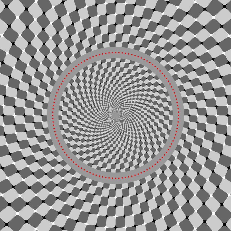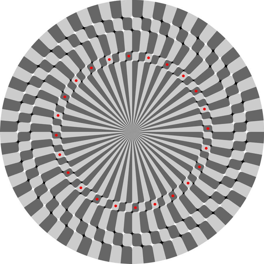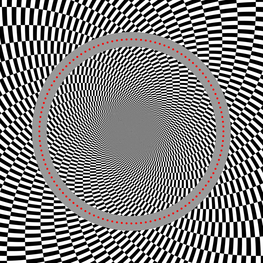Ouchi-Spillmann illusion: The ring made up of red dots appears to rotate