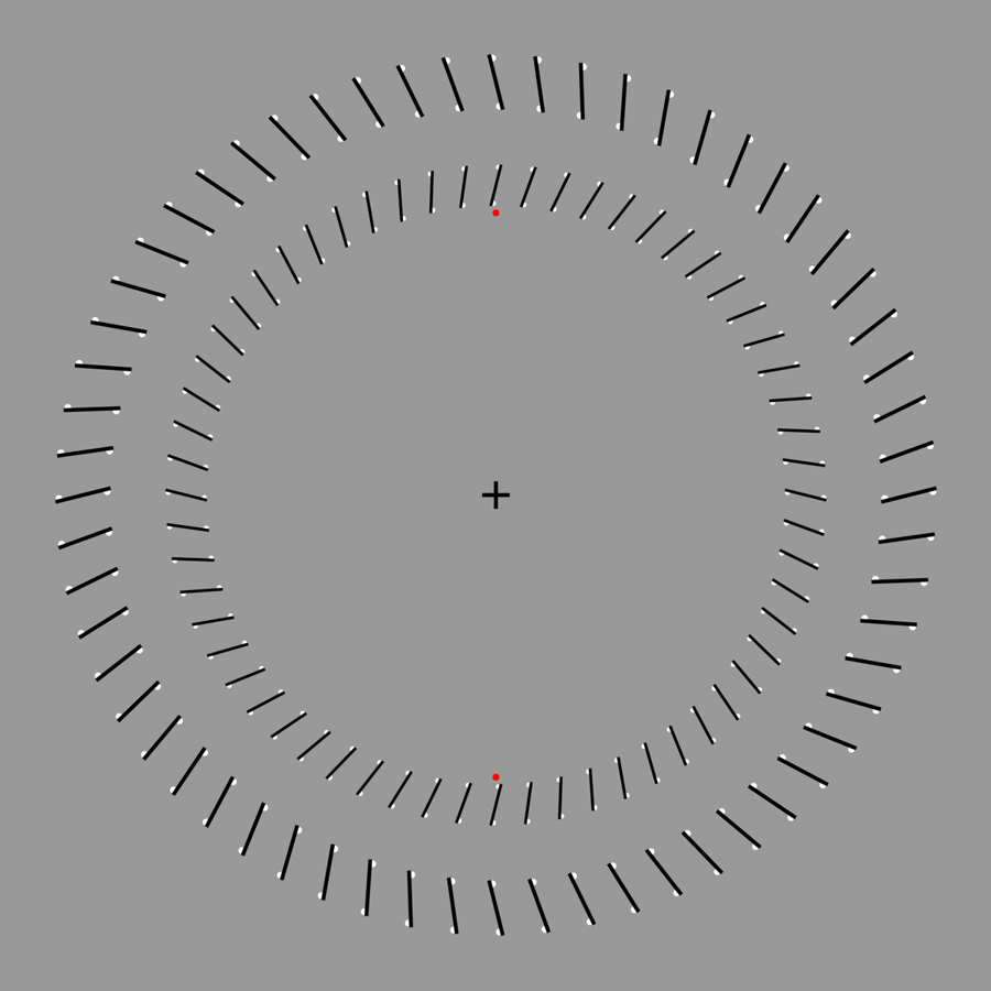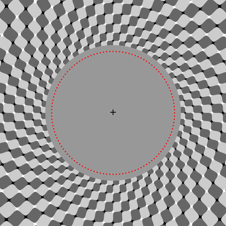 Motion contrast demo using a rotating version of the Ouchi-Spillmann illusion: The ring made up of red dots appears to rotate counterclockwise when observers approach the image fixating at the center, whereas