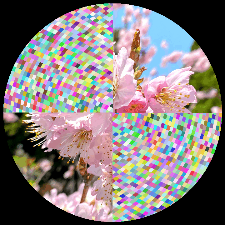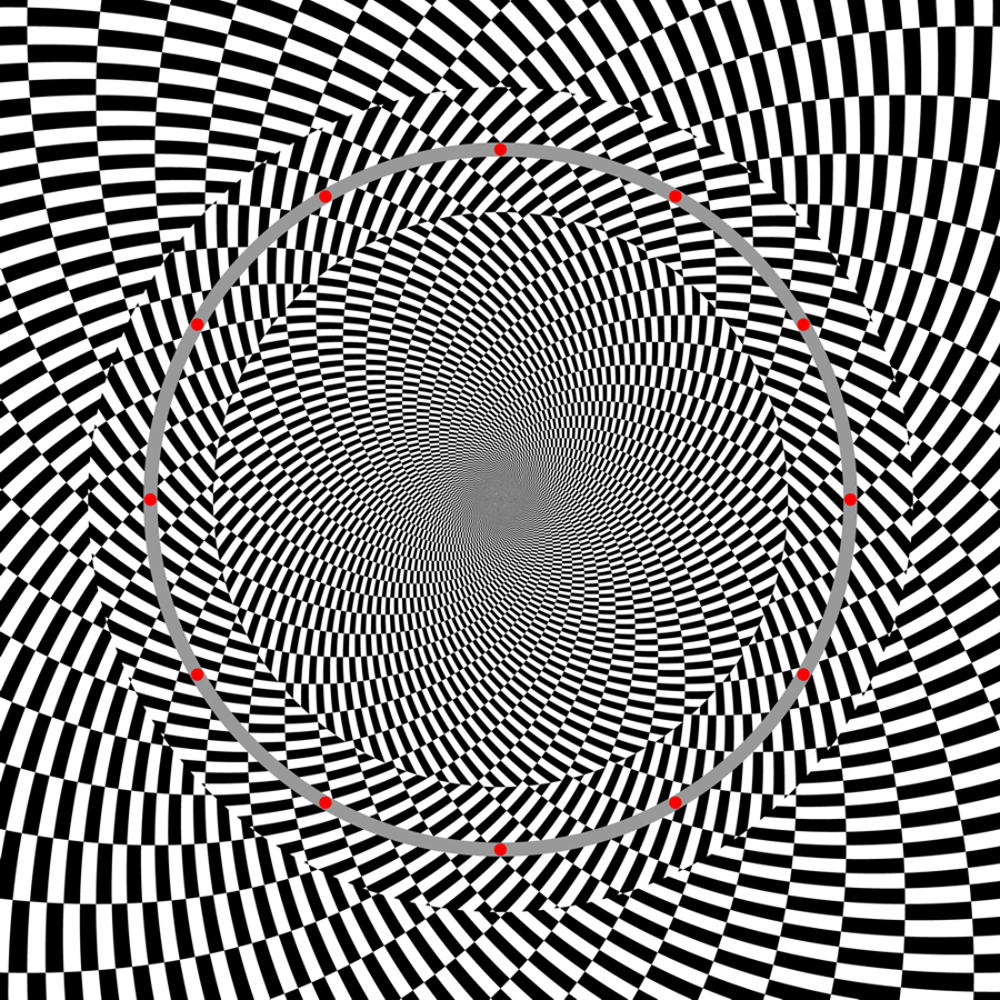 中心を見ながら図に目を近づけると赤いドットのリングは時計回りに回転して見える。遠ざかる時は反時計回り。中心を見ながら図を回転させると、リングは拡大・縮小して見える。