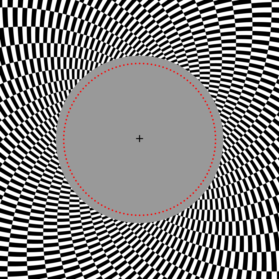 Motion assimilation (motion capture) demo using a rotating version of the Ouchi-Spillmann illusion: The ring made up of red dots appears to rotate counterclockwise when observers approach the image fixating at the center, whereas it appears to rotate clockwise when they move away from the image. Moreover, the ring appears to expand or contract when observers rotate the image fixating at the center.