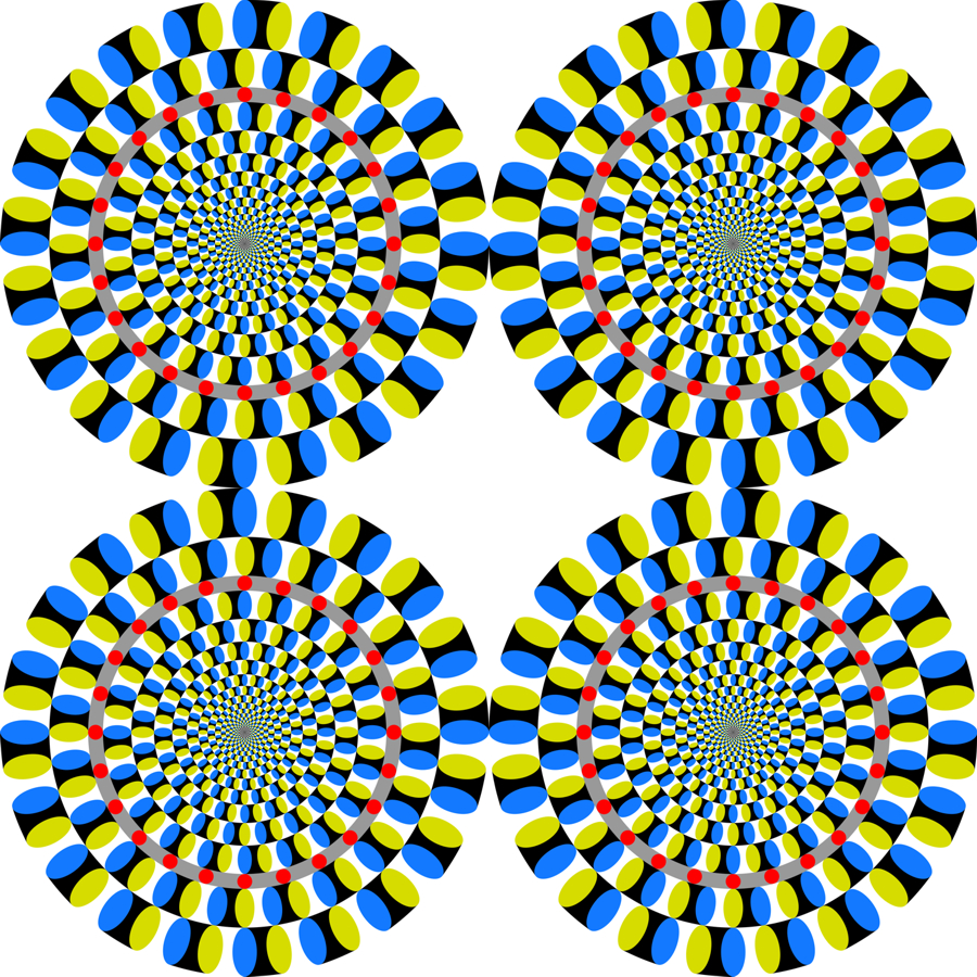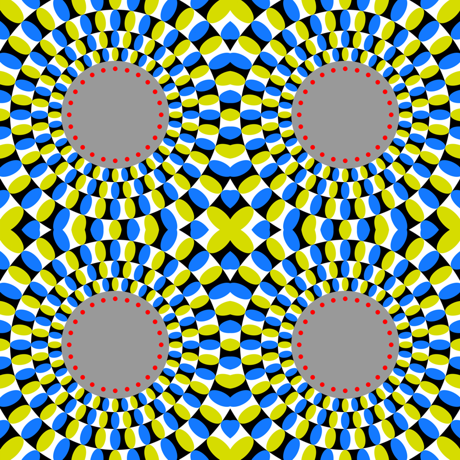 Motion contrast demo using the Rotating snakes illusion (optimized Fraser-Wilcox illusion): The upper-left and lower-right red rings appear to rotate clockwise whereas the upper-right and the lower-left ones counterclockwise.