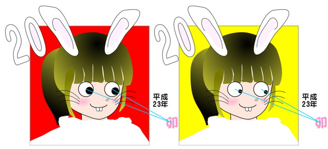 The diameter of the irises in the right image is half of that of the irises in the left image, but the former appears to be much smaller than it is. Moreover, the girl appears to look at "23", but actually she looks at the pink Chinese character. This eye-direction illusion was first produced by Professor Watanabe.