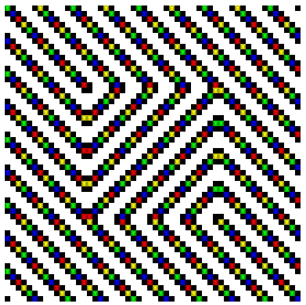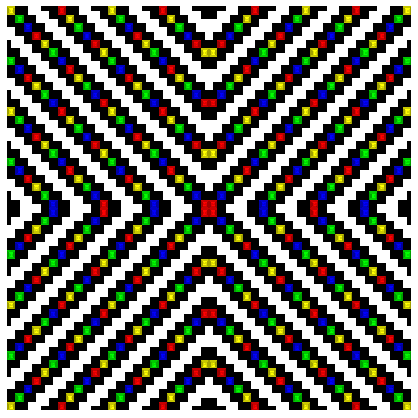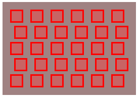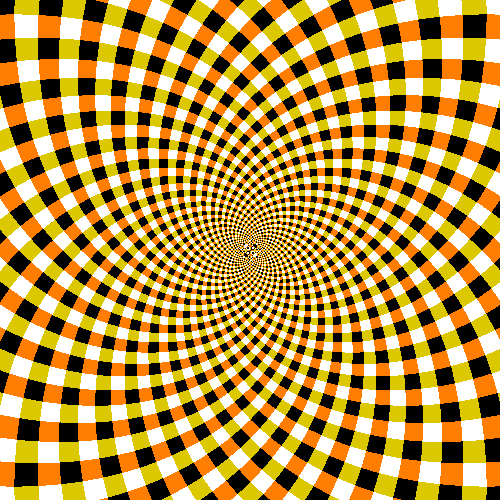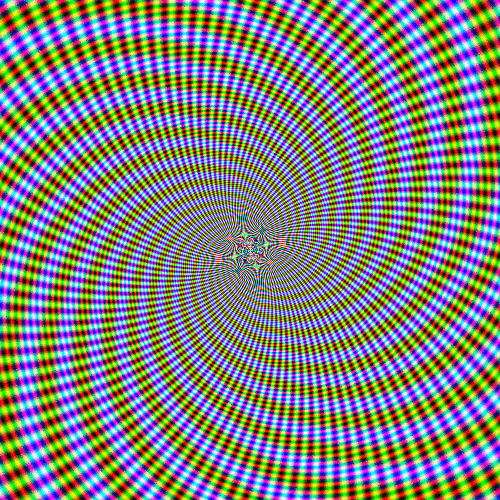 Color squares appear to scintillate. The figure appears to bulge out slightly though this consists of only squares.