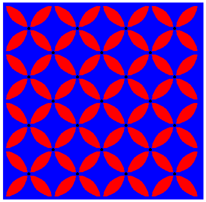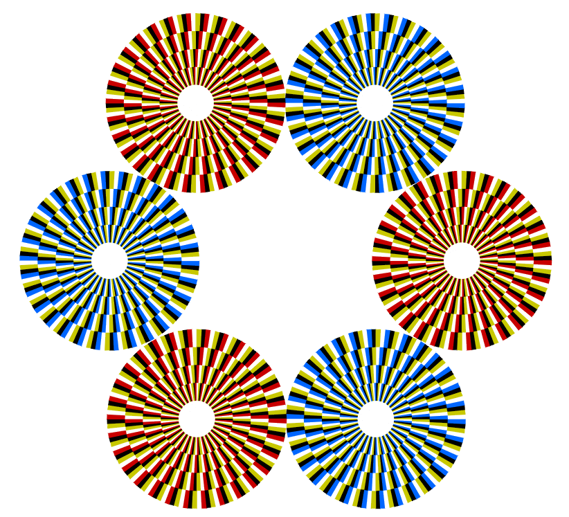 Six white circles appear to scintillate. Moreover, red circles appear to rotate clockwise while blue ones counterclockwise.