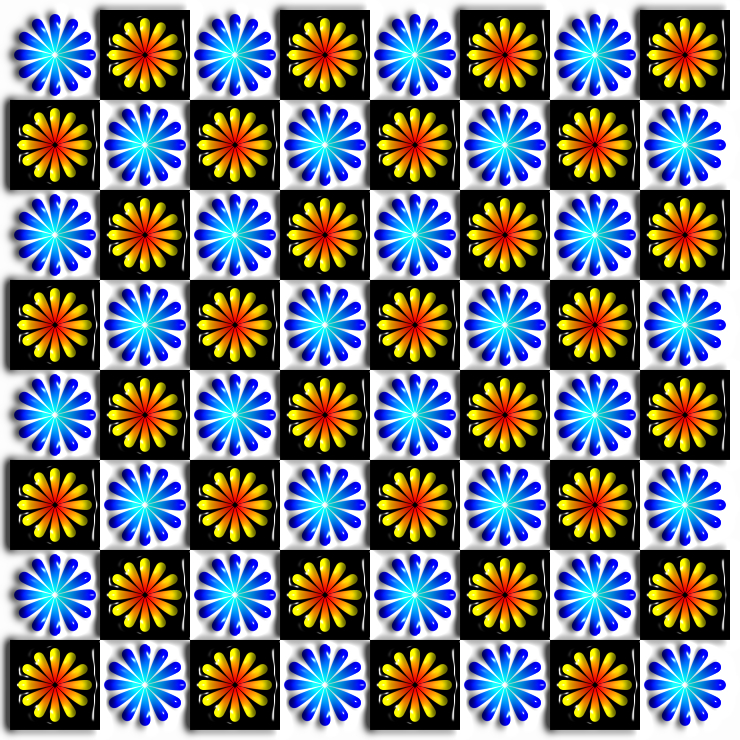 The image appears to scintillate. Illusory orange appears to be induced in the center of each blue flower while illusory blue appears to be seen in the center of each orange flower.